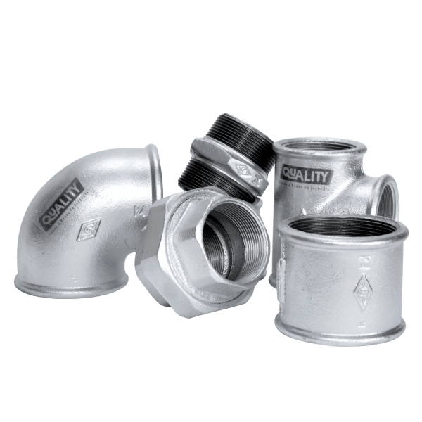 Conexões em ferro fundido maleável galvanizado com rosca BSP, utilizados para condução de fluidos não corrosivos em instalações industriais, prediais, pneumáticas e redes de incêndios. São fabricadas de acordo com as normas NBR 6943 com acabamento galvanizado e classe de pressão de 150 LBS.